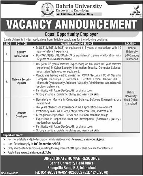 The last date to apply for this job is 10th December 2025.Bahria University Of Discovering Knowledge Jobs In Islamabad December 2025 Advertisement
