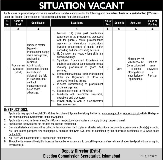 Only male candidates can apply forElection Commission Secretariat Jobs In Islamabad December 2025 Qualification /Experience Required: Minimum Master’s Degree in Procurement, Supply Chain Management, engineering, Business Administration, Economics, Finance. A certificate/ diploma in the field of Procurement or contract management shall
